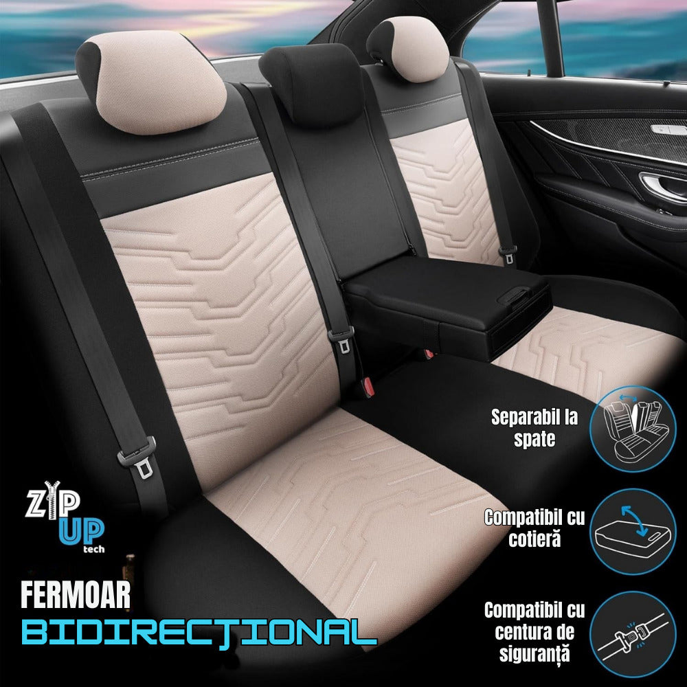 Compatibilitate universala: Datorita designului multifunctional al banchetei si tehnologiei zip-up din spate, husele sunt compatibile cu majoritatea tipurilor de scaune din spate, fiind prevazute cu fermoare triple pentru o ajustare optima.