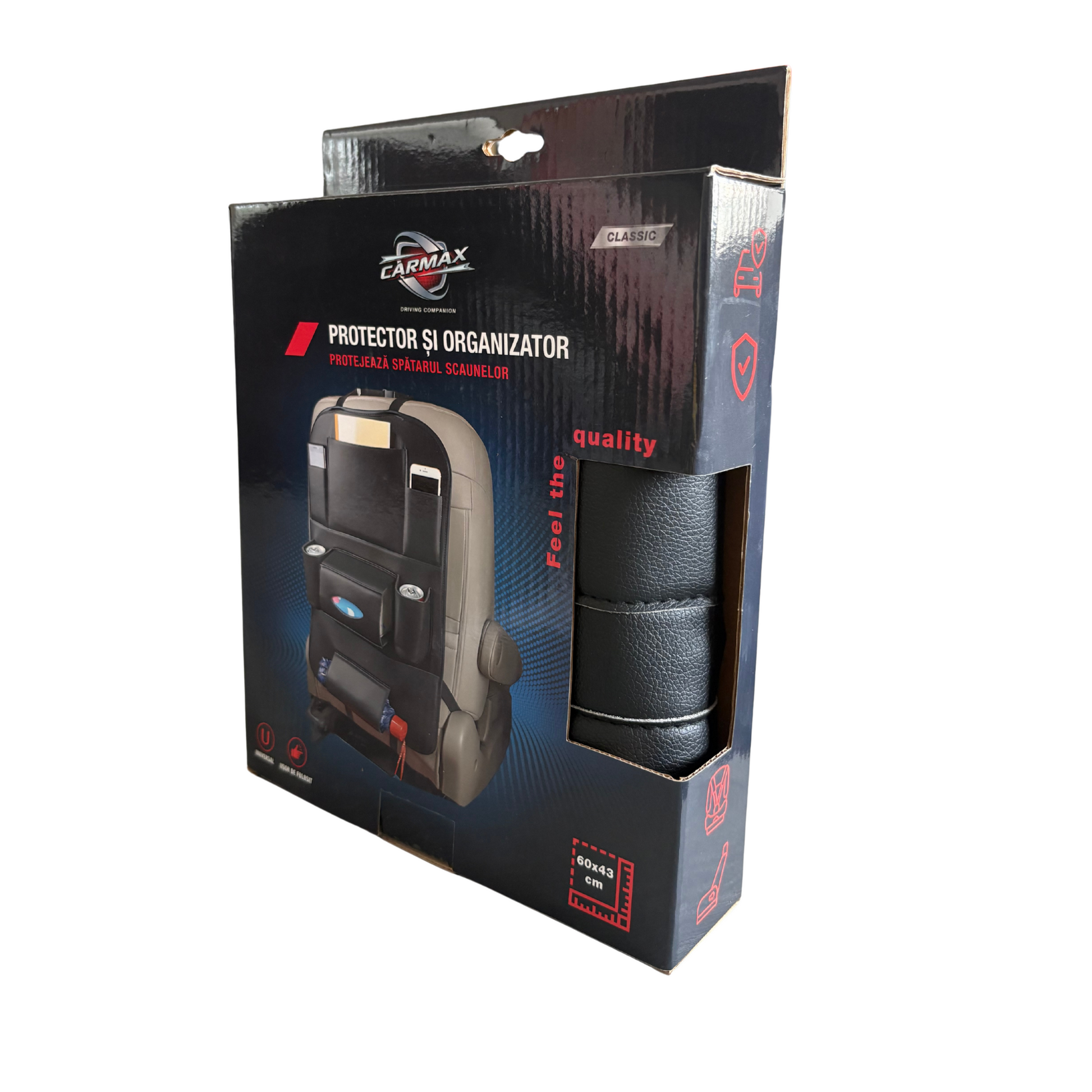 Transforma interiorul masinii intr-un spatiu ordonat si elegant cu CARMAX Protector si Organizator Spatar – Piele. Acest accesoriu multifunctional protejeaza spatarul scaunului din fata si ofera un loc convenabil pentru depozitarea obiectelor esentiale.