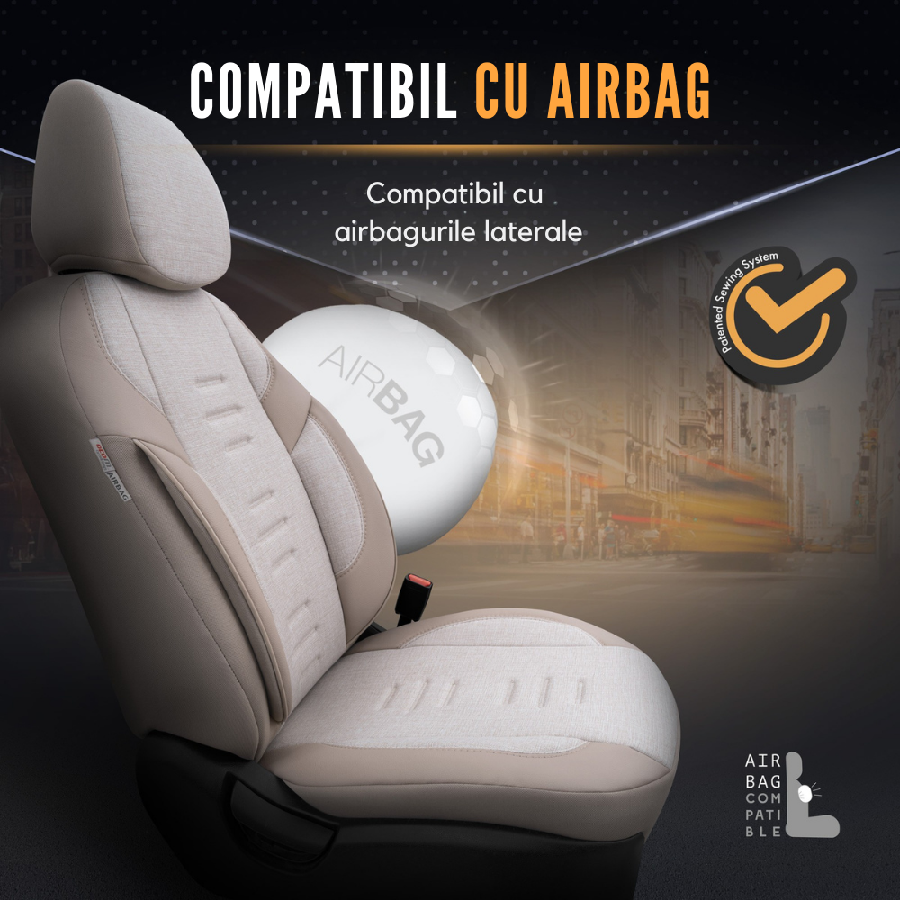 Compatibilitate cu airbag-uri: Husele sunt dotate cu cusaturi speciale de securitate, realizate sub supravegherea stricta a inginerilor, utilizand masini de cusut dedicate echipamentelor auto originale. Fiecare produs destinat scaunelor cu airbag este etichetat si are un cod de bare unic, garantand utilizarea tehnicii speciale de cusatura pentru siguranta airbag-ului.