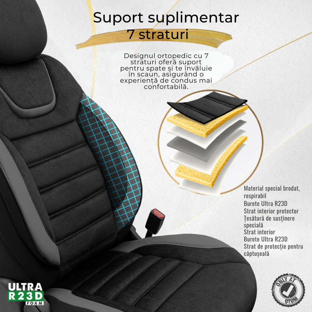 Design ortopedic cu 7 straturi: Ofera suport lombar si sporeste confortul in timpul calatoriilor lungi, contribuind la o experienta de condus placuta.