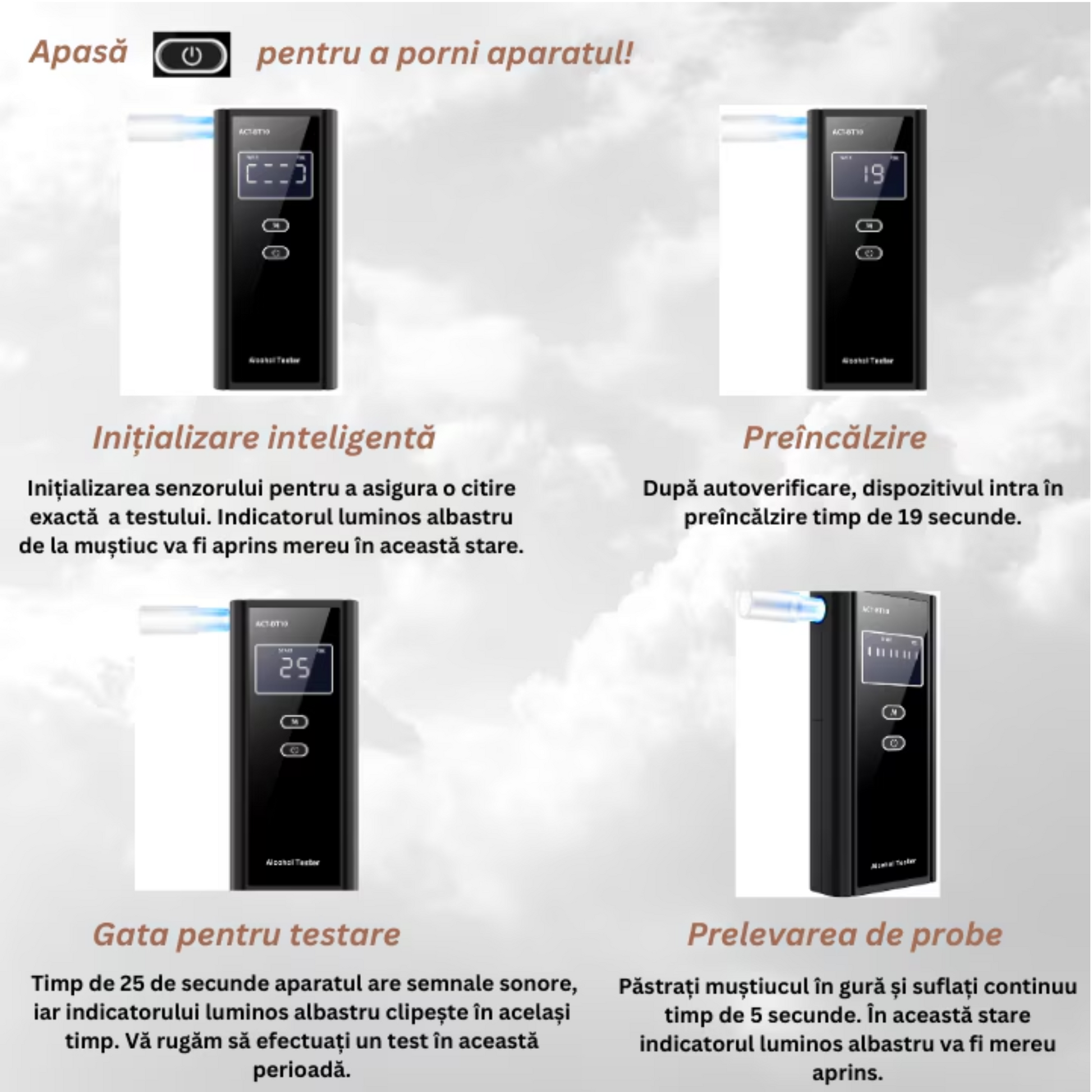 După utilizare, îndepărtați mustiucul și depozitați testerul într-un loc uscat.